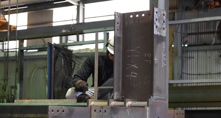 円滑なチームワークで図面を基に溶接をする前に部材を組み合わせる作業です。